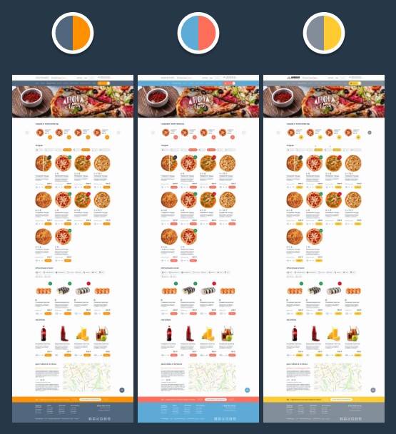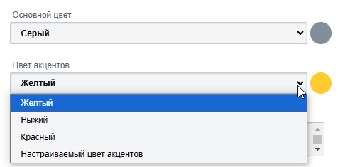 Можно использовать наши цветовые схемы или задавать свои цвета основного цвета (фоны закреп меню в шапке, подвал, мобильное меню) и акцентов (кнопки, фон блока подписки, корзина).
