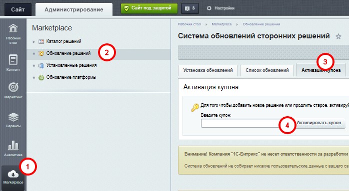 5. Перейдите в админку своего сайта, в раздел "Обновление решений" (Marketplace > Обновление решений), перейдите на вкладку "Активация купона" и внесите ключ который пришел к вам на почту после покупки решения