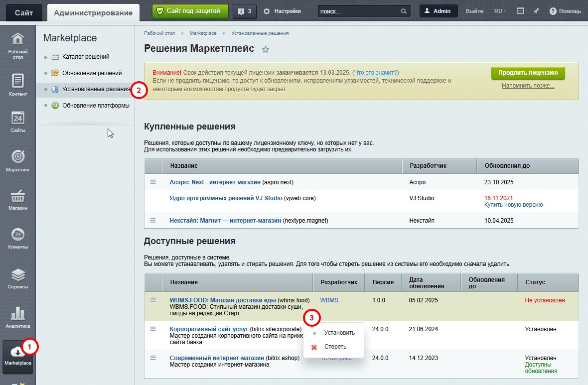 6. Перейдите в раздел "Установленные решения" (Marketplace > Установленные решения), внизу в списке "Доступные решения" найдите решение WBMS: FOOD, нажмите правой клавишей мыши на нем и выберите "Установить", далее щелкните на зеленую кнопку "Установить"