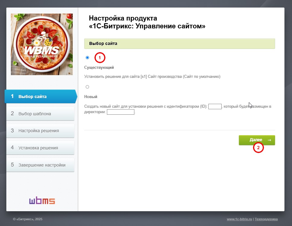 8. После запуска мастера установки решения, на первом шаге "Выбор сайта" необходимо выбрать сайт "Существующий" или "Новый" куда будет производиться установка решения, если вам необходимо установить решение на новый сайт, то выберите "Новый" введите ID сайта (2 буквы) и укажите директорию для инсталляции.
